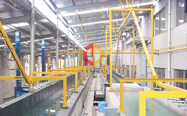 浸槽式前處理方法是涂裝前處理常用的方法之一。其過程是將被處理的工件浸沒在盛有槽液的前處理槽中,經過一定時間的化學反應來完成除油,除銹,磷化及鈍化等工序。按生產性質和工件輸送方式可分為通過式和固定式兩類浸漬設備。通過式浸漬設備是懸掛輸送機將工件連續地輸入浸漬槽而進行表面處理。固定式浸漬設備通常是用電葫蘆或自行車將工件間歇地輸入浸槽而進行表面處理。