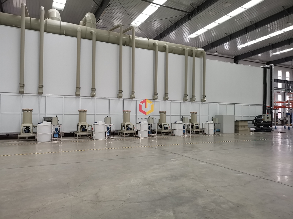 2、前處理生產線各工序噴淋管布置在隧道內,噴淋由各液槽的泵來提供。